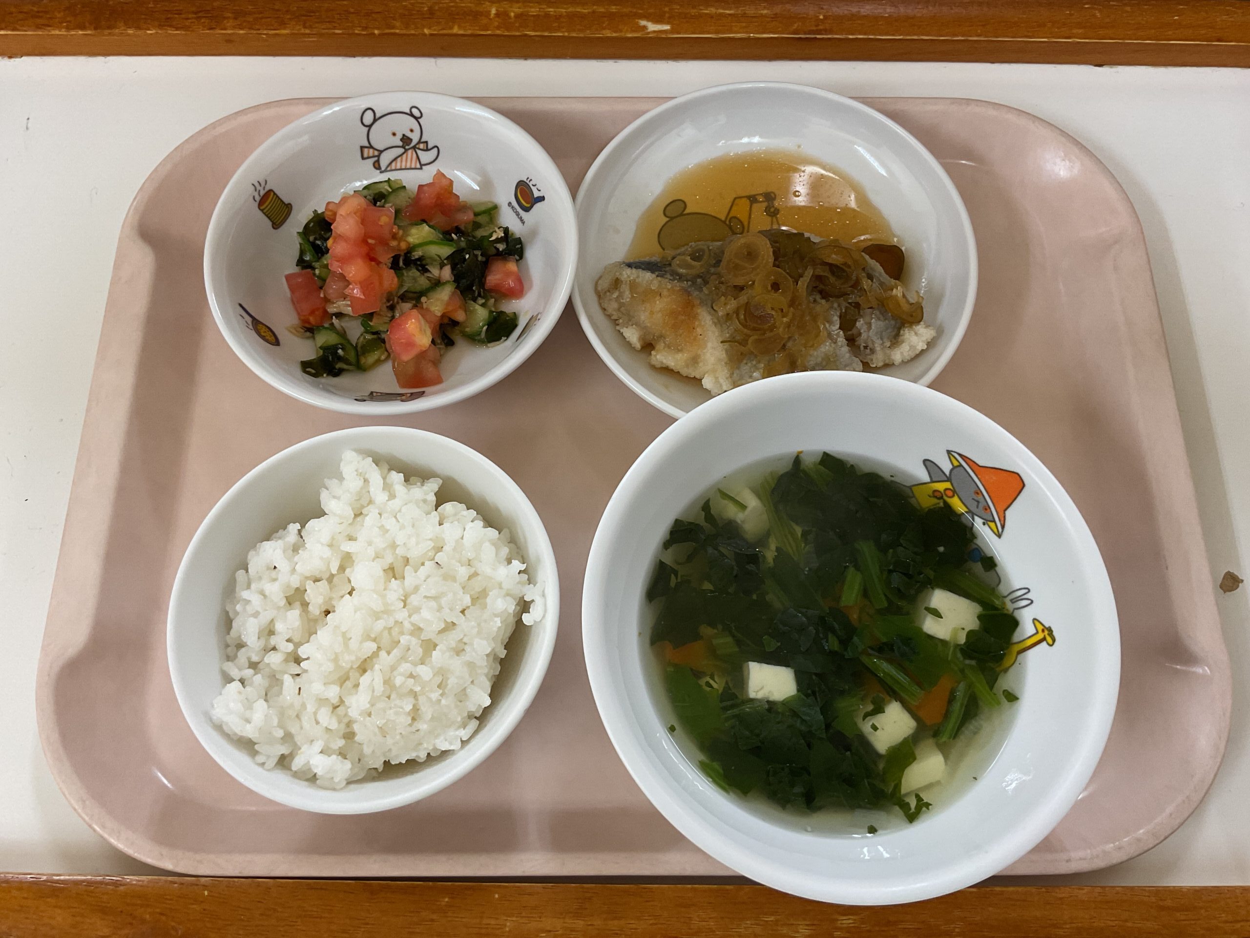 〈給食〉さわらのねぎソースかけ、ごはん、トマトとチキンの中華和え、ほうれん草のスープ。