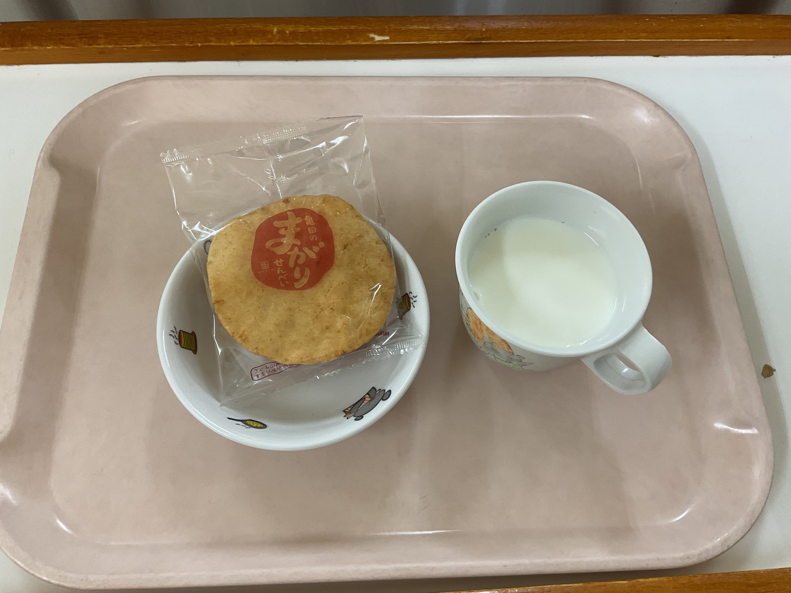 〈午後のおやつ〉せんべい(まがりせん)、牛乳。